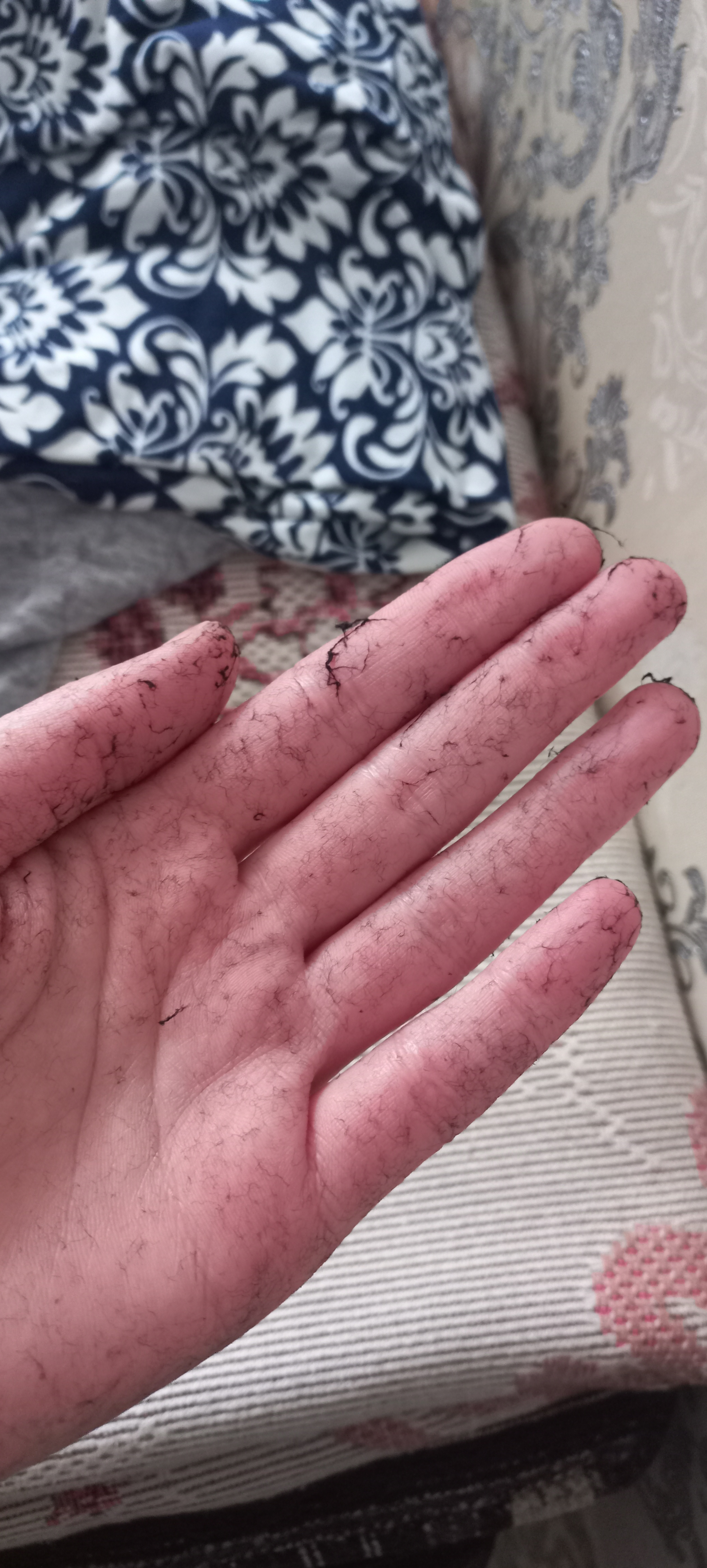 Начес уплыл в канализацию. Стала стирать вручную сразу после покупки в воде 30 градусов. Вода чёрная как само белье. Думала, что потекла краска. Вылила воду, на ванну осел начес. То есть вода чёрная от вылезшего начеса. Стала бесконечно полоскать, думала, что вот-вот вопрос решится. Но нет. На фото рука после 18-го!!!! Полоскания и смены воды. Бесполезно. Первая такая покупка у меня в MF