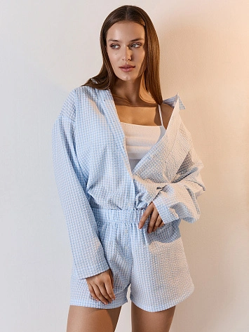 Голубая клетка и свободный крой делают эту рубашку универсальной. Её можно носить как самостоятельную вещь или сочетать с домашними брюками и шортами.