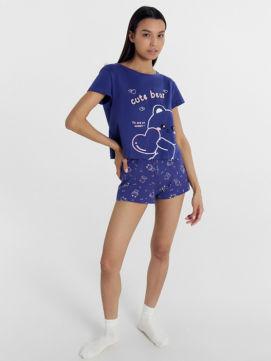 Комплект женский (джемпер, шорты) синий с милыми зверьками