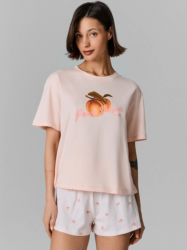 Розовый домашний комплект с сочным принтом персика и надписью «Peach season is here», которая переводится как «Сезон персиков настал». Лёгкая и тёплая фраза, которая добавляет образу летнюю свежесть.