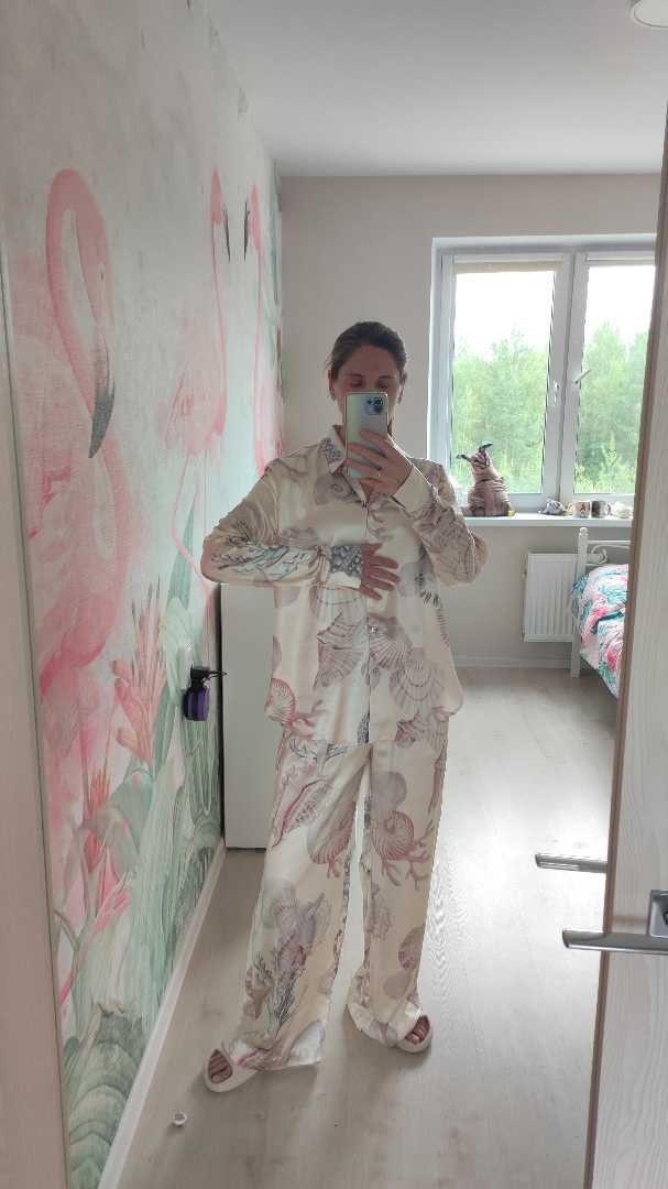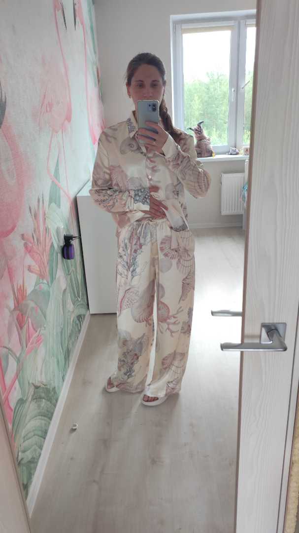 Брала комплект с ракушками, мне очень понравился, ткань указана чистый полиэстер , но очень плотный, приятный на ощупь и в носке, за счет оверсайз кроя не жаркий, милые пуговички-ракушки,брюки на рост 168 длиноваты, но подложила сама на 3 см и норм, брала на 42 верх размер 44 рубашки и на 44 низ брюки 44 размера