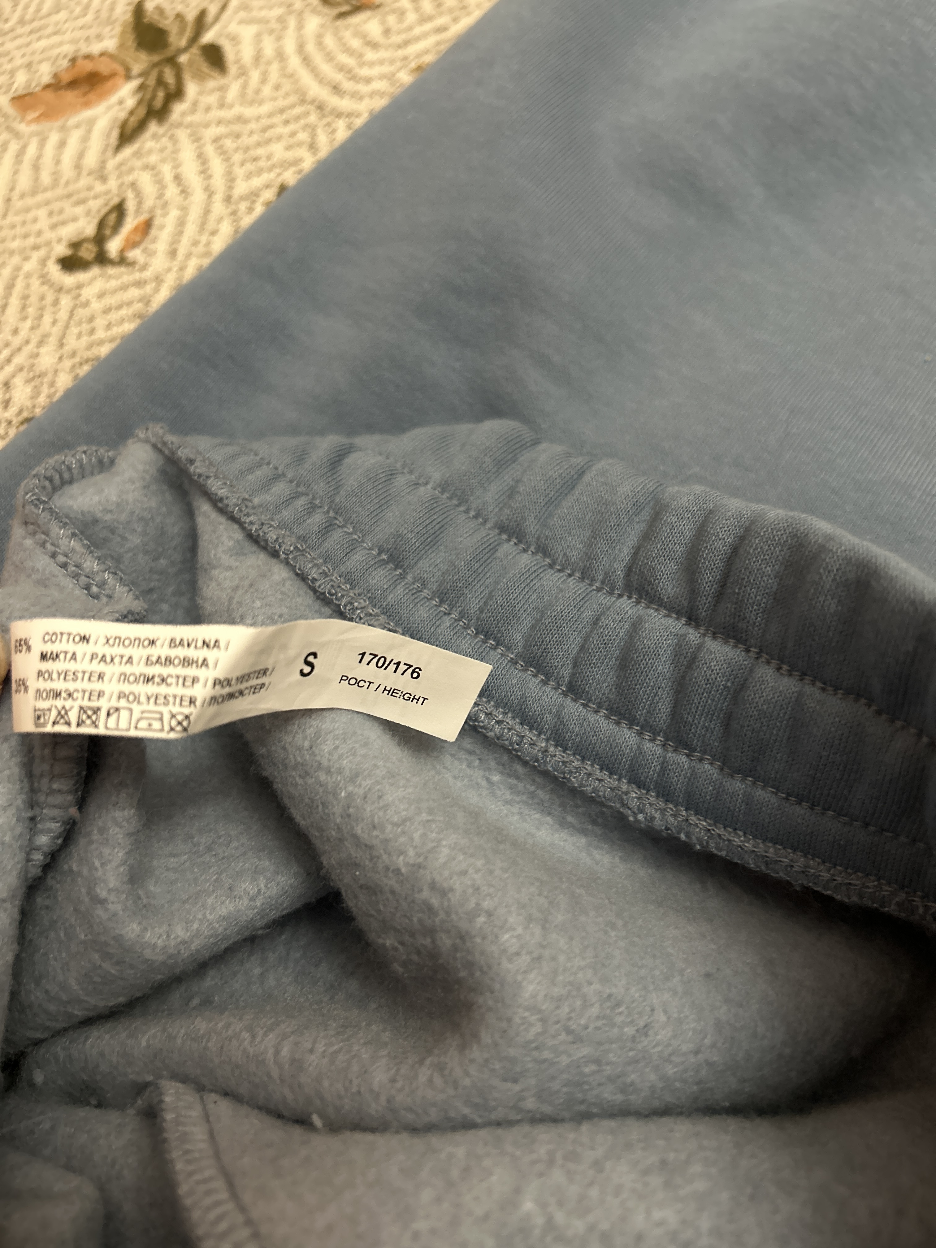 Покупала голубые, размер S рост 170/176 на свой рост 168 см и ОБ 94. Тёплые, приятные. Сели вроде нормально, но будто коротковаты. Когда сажусь - вся щиколотка голая, прилично голая, подскакивают сантиметров на 5-10 какая подстрел. Ноги внизу мёрзнут из-за этого. Решила перемерять длину штанин, вдруг не тот размер купила (хотя на маркировке на брюках написано 170/176). Так вот в описании изделия длина по внешнему боковому шву указана 104,2 см. А по факту 100,2 см. Длина по внутреннему шву соответствует указанной в описании.