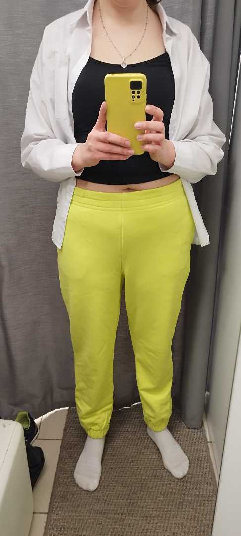 Брюки цвет лайм, размер М, ткань плотная, катышков нет. Носятся хорошо. Рекомендую к покупке. Мой обхват талии 92,бедра 106.