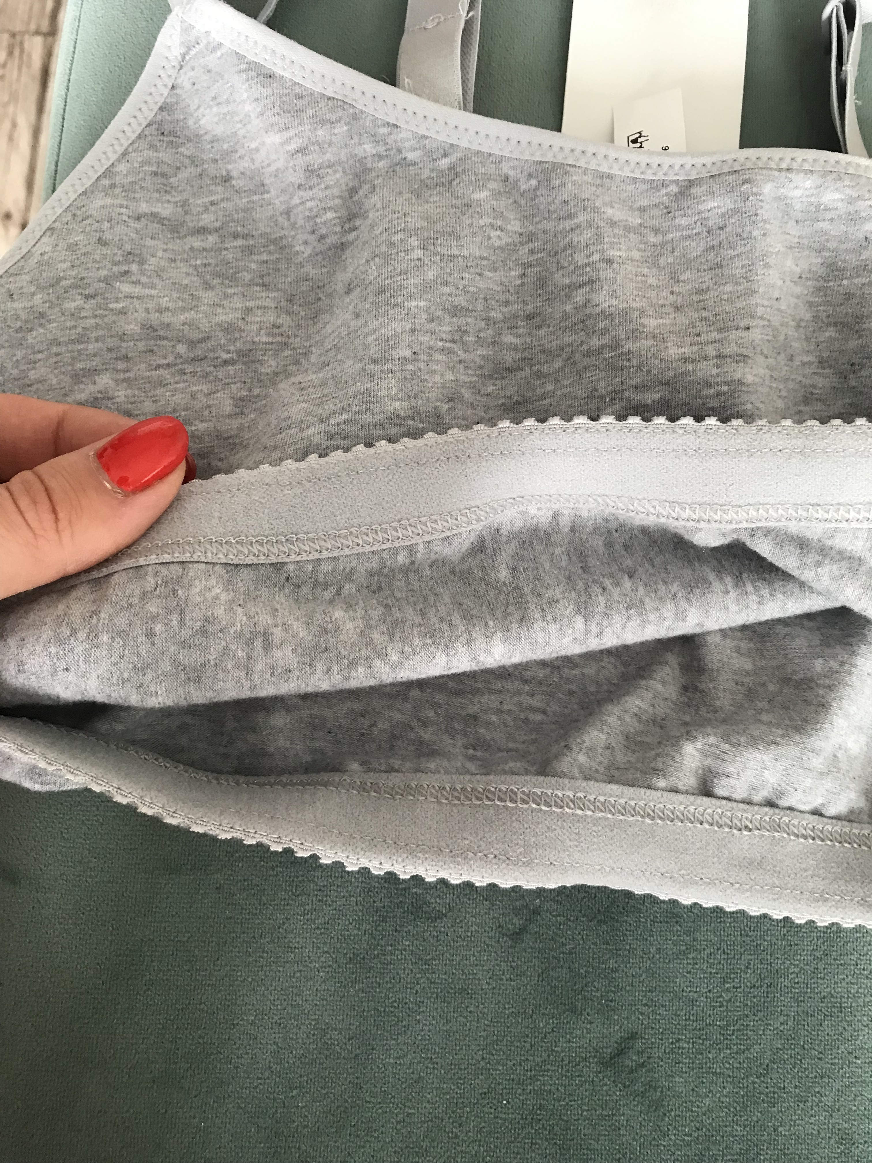 Приятный хлопок, удобные шлейки. Но маломерит. На объём груди 86 ( до беременности) всегда носила S, XS. Взяла М на нынешнюю грудь 90 - мал в резинке.