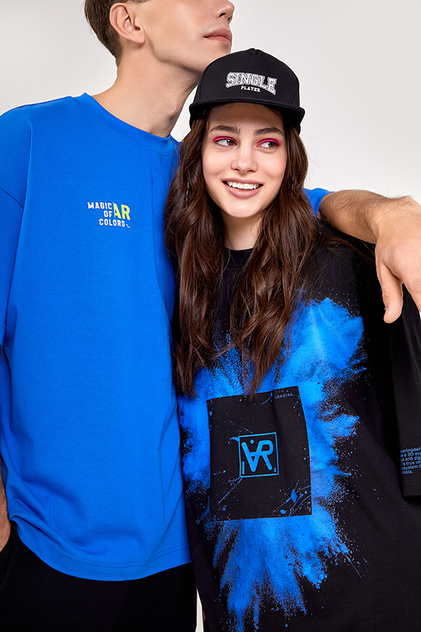 Линейка одежды выдержана в стильном спортивном стиле и ориентирована на молодежную аудиторию. Модели обладают яркими принтами, а рисунки на футболках превращаются в AR-анимацию. Получается два слоя – реальный и виртуальный.