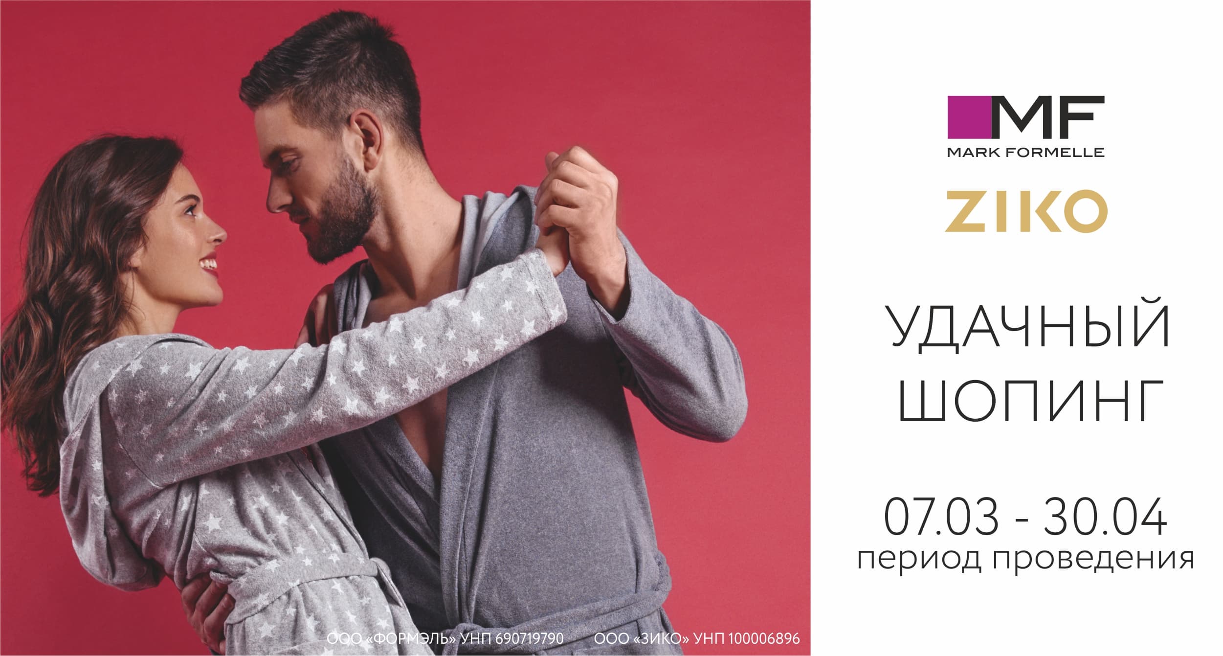 При покупке на любую сумму в период с 7 марта по 7 апреля 2019 г. в магазинах Ziko клиенту выдается купон на скидку 10% на покупки в сети магазинов Mark Formelle, участвующих в акции. Срок действия купона - с 7 марта 2019 г. по 30 апреля 2019 г.