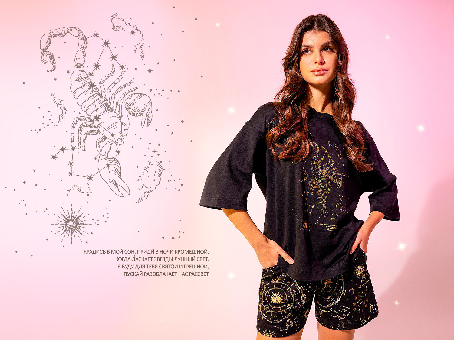 Бренд разработал 12 уникальных пижам со знаками зодиака. Комплекты выполнены из премиального хлопка с глиттерным изображением созвездий. Также капсула дополнена 2 универсальными сатиновыми комплектами, состоящими из брюк и рубашки.